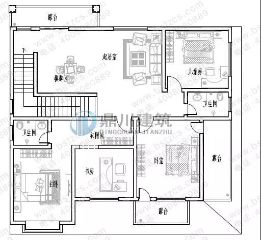 二 層: 起居室(附陽臺)、臥室(附衣帽間,書房,衛生間)、臥室(附2露臺)、臥室、衛生間