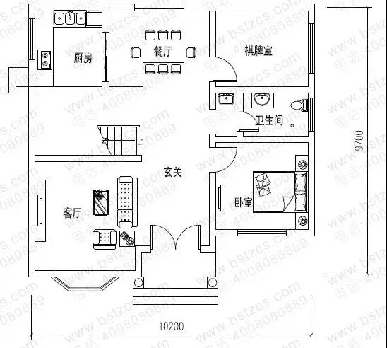 一 層:玄關、客廳、臥室、棋牌室、廚房、餐廳、衛生間