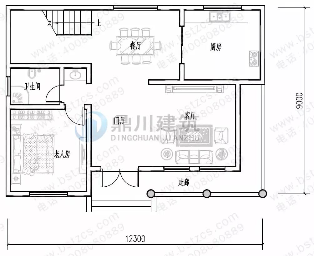 一 層:走廊、門廳、客廳、臥室、廚房、餐廳、衛生間