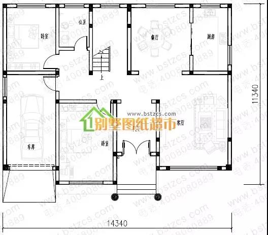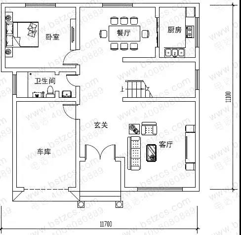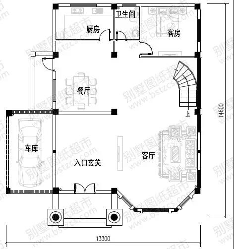 一 層:入口玄關(guān)、客廳、餐廳、廚房、客房、衛(wèi)生間、車庫