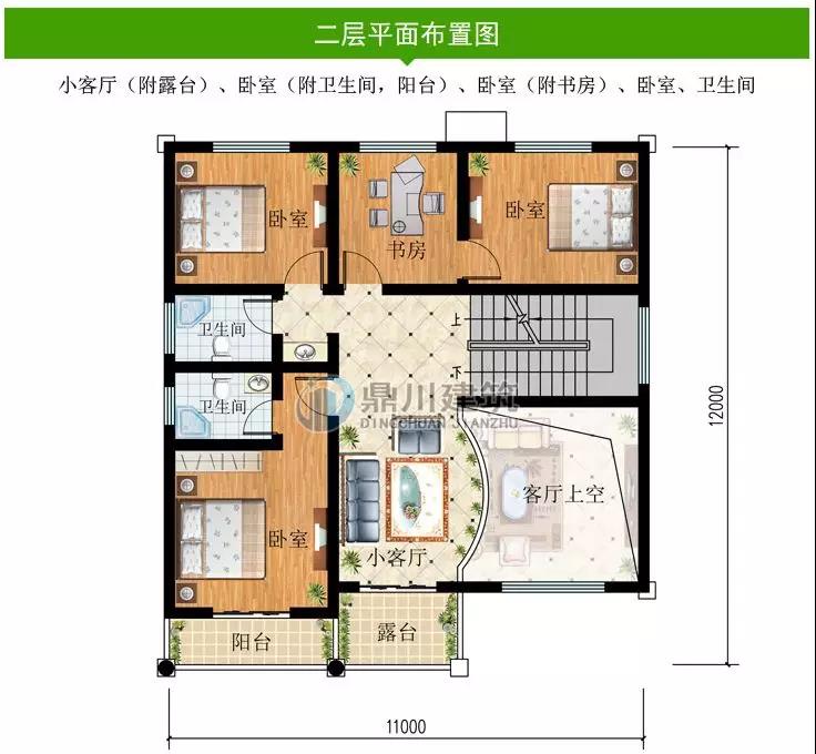 二 層:休息區(qū)(附陽臺(tái))、臥室(附衛(wèi)生間)、2臥室、書房、衛(wèi)生間