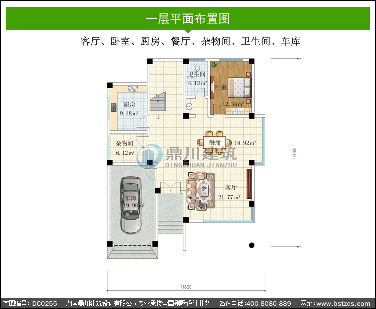 | 一 層: | 客廳、臥室、廚房、餐廳、雜物間、衛生間、車庫 | |||