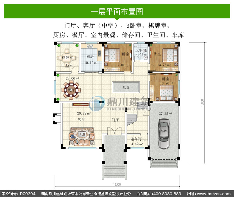 一 層: 門廳、客廳(中空)、3臥室、棋牌室、廚房、餐廳、室內景觀、儲存間、衛生間、車庫
