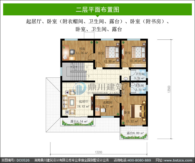 | 二 層: | 起居廳、臥室(附衣帽間、衛(wèi)生間、露臺)、臥室(附書房)、臥室、衛(wèi)生 間、露臺 | |||
