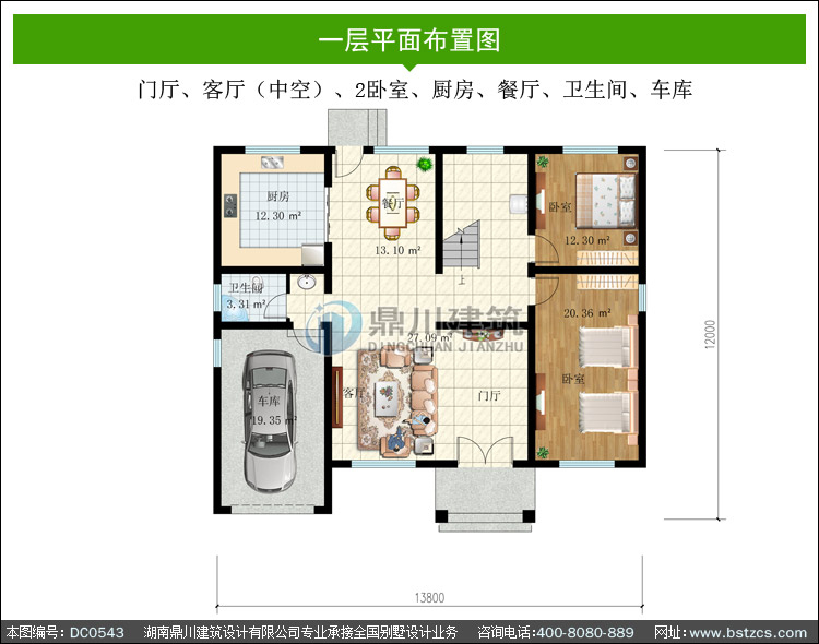 | 一 層: | 門廳、客廳(中空)、2臥室、廚房、餐廳、衛生間、車庫 | |||