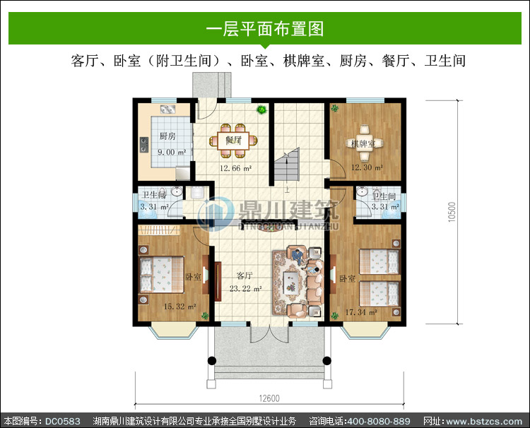 | 一 層: | 客廳、臥室(附衛生間)、臥室、棋牌室、廚房、餐廳、衛生間 | |||