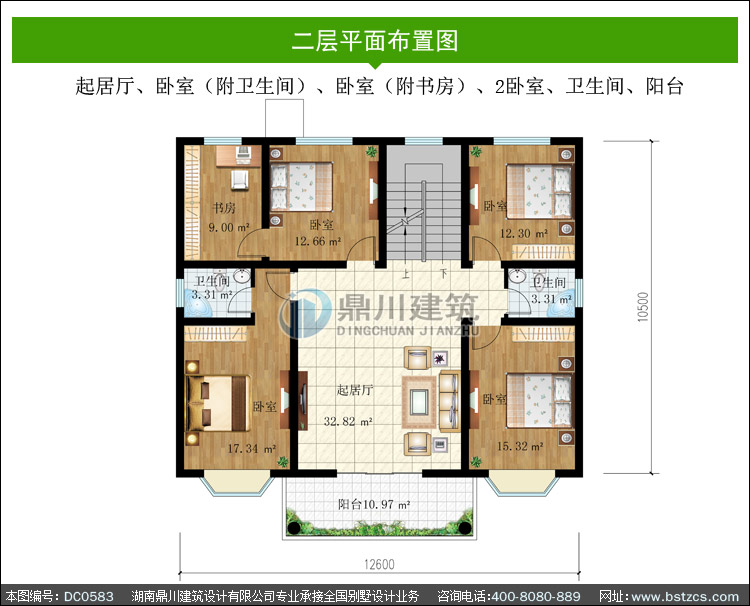 | 二 層: | 起居廳、臥室(附衛生間)、臥室(附書房)、2臥室、衛生間、陽臺 | |||