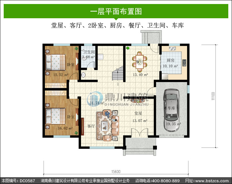 | 一 層: | 堂屋、客廳、2臥室、廚房、餐廳、衛(wèi)生間、車庫(kù) | |||